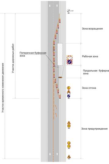 3.11 продольная буферная зона: Участок дороги, отделяющий транспортные средства от рабочей зоны по пути следования или отделяющий транспортные средства, движущиеся в противоположных направлениях по участку одной полосы.