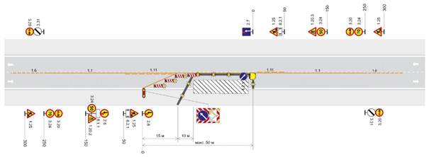 демпфирующим устройством, проблесковым маячком желтого или оранжевого цвета и временными дорожными знаками.